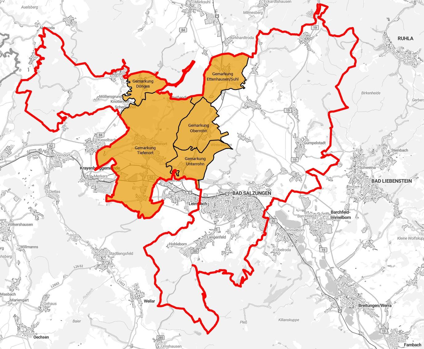 Abbildung 1: Übersichtsplan mit dem Geltungsbereich der Ergänzung des Flächennutzungsplanes der Stadt Bad Salzungen um die Ortsteile Tiefenort, Hämbach, Oberrohn, Dönges, Unterrohn und Ettenhausen an der Suhl (Ergänzung orange markierte Fläche; rote Linie Grenze der Stadt Bad Salzungen; Kartengrundlage: DL-DE->BY-2.0: © GeoBasis-DE / BKG (2025) dl-de/by-2-0; ohne Maßstab)
